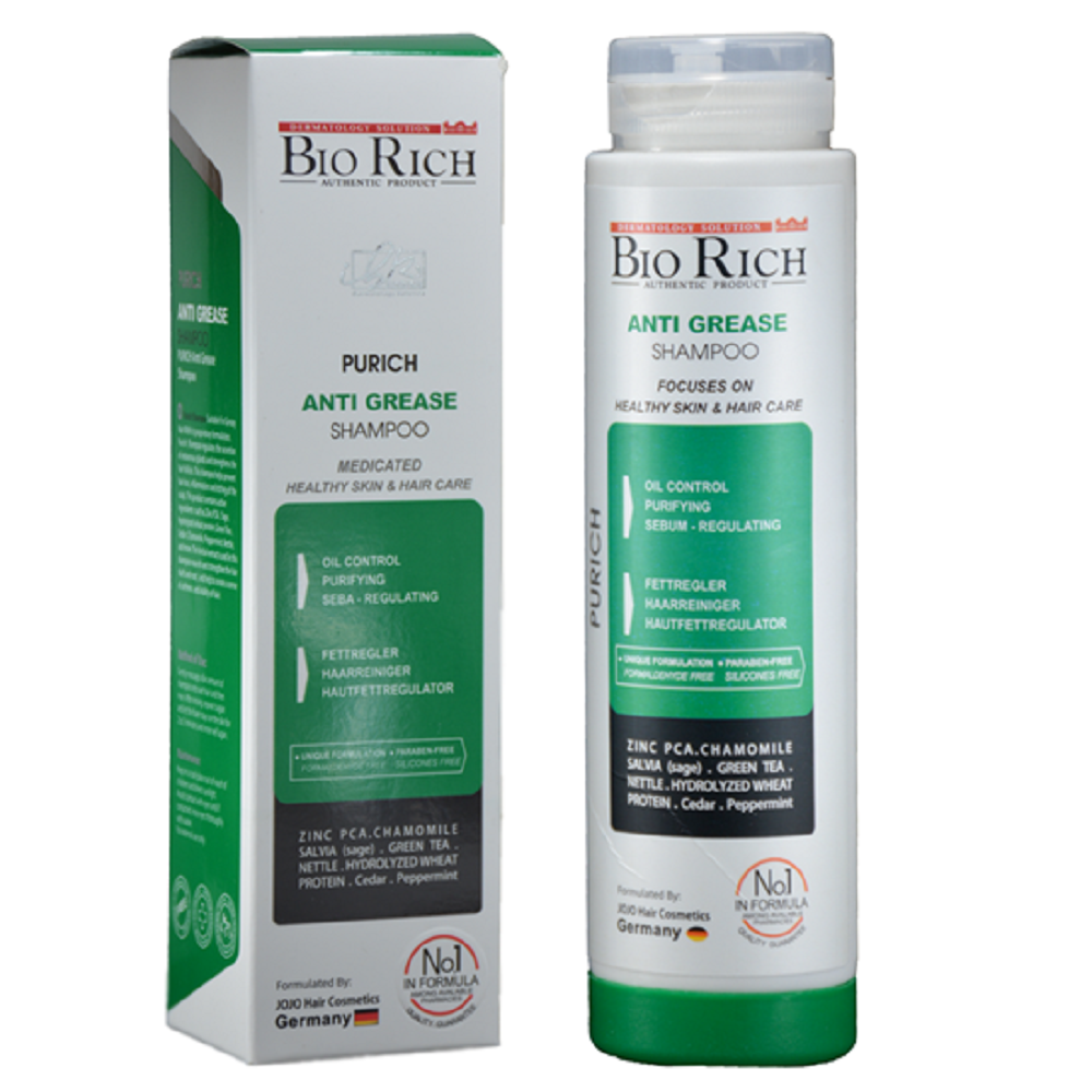 شامپو پیوریچ مخصوص موهای چرب Bio Rich، باعث کنترل و رفع چربی سرمی‌شود و همچنین ضدعفونی کننده با بوی مطبوع می‌باشد.